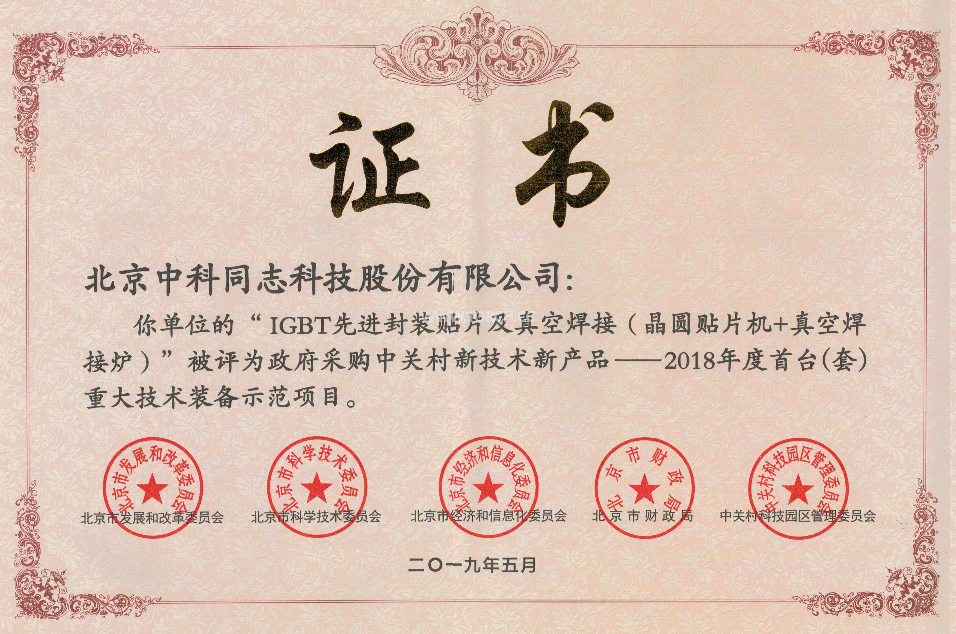 2019年度中關(guān)村國家自主創(chuàng)新示范區(qū)首臺(套)重大技術(shù)裝備示范項目技術(shù)評審工作已經(jīng)結(jié)束,北京中科同志科技股份有限公司研制的“IGBT先進封裝貼片及真空焊接”通過專家評審,被評為政府采購新技術(shù)新產(chǎn)品——2018年度首臺(套)重大技術(shù)裝備示范項目。
