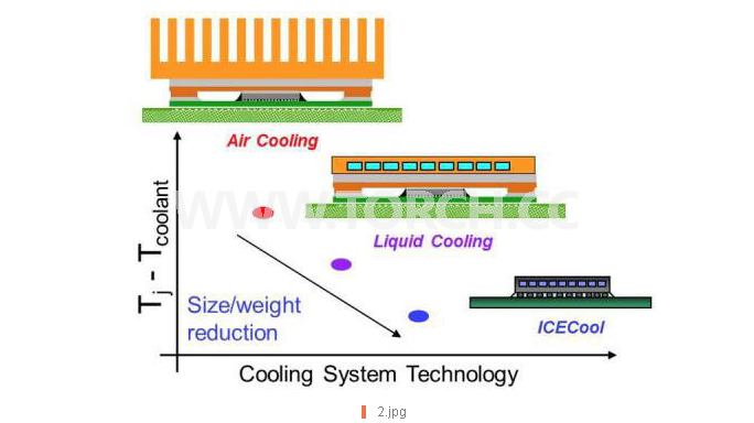 傳統的空調冷卻方式使用冷空氣和散熱片(頂部),經證實不如溫水冷卻(中央),而DARPA ICECool計劃開發的技術承諾可借由使用介電質蒸氣(底部),進一步縮減尺寸與成本。