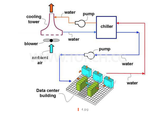 借由水冷系統,IBM得以讓資料中心無需再使用空調。但為了ICECool計劃而開發的絕緣介電質蒸汽系統,也不需要使用冷卻器(右上)和冷卻塔(左上)